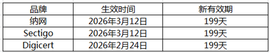 · 证书续期:根据各品牌生效日起,所有续期的SSL证书最长有效期不超过199天。